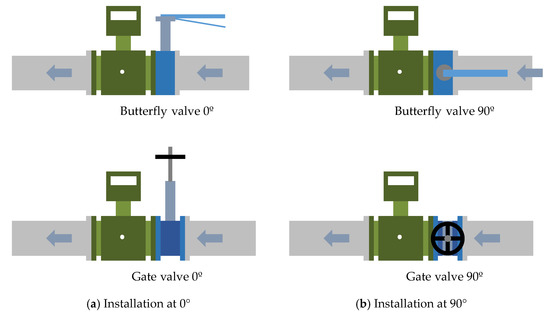 - Butterfly Valve: For each meter, accuracy tests were carried out for various upstream distances between the valve and the meter, orientation of the valve, defined by the orientation of the butterfly shaft, as depictured in Figure 4, and closing position. More precisely the following closure degrees were considered in the tests: 0%, 33%, 66% and 90%. Flow profile distortions have shown to cause dissimilar effects on the measuring errors of the meters depending on the closing position of the disc, the distance between the meter and the valve and the working principle of the meter.