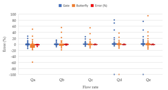 The work conducted also examined the influence of a gate valve installed upstream the meters under study. As shown in Figure 5, which summarizes the results of the tests conducted, gate valves may induce a severe effect on the accuracy of water meters, especially at large flows, producing a significant over registration of water volumes. Despite the fact that some negative errors have also been observed under the presence of a gate valve, the negative errors obtained were of an order of magnitude smaller when compared to the positive ones. This can be easily confirmed by the median an average value of the error distribution in Figure 5.