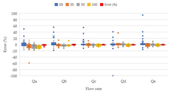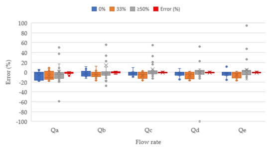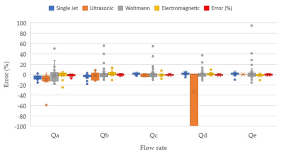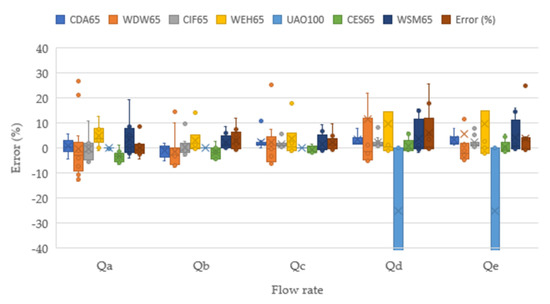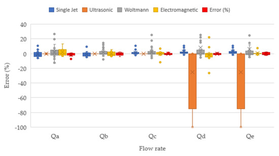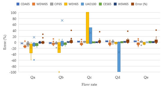 Figure 15 depictures the error distribution of the various brands of meters examined in this wok. The typical interquartile range magnitude is in most cases between 10–15%. Only few of the meters tested showed a narrow interquartile range. Examples of this performance are the meters marked as CIF65, single-jet, and UAO100, ultrasonic.