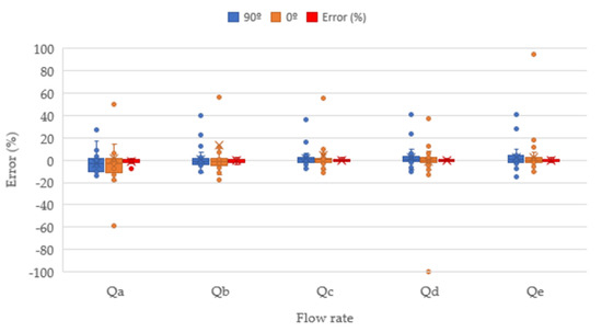 Unlike with butterfly valve (Figure 7), there are no significant differences on the effect of the disturbance between 90° and 0° arrangements of the valve, as shown in Figure 12. The median of the error distribution under both arrangements is close to cero, meaning that positive and negative error are equally probable to occur. However, it has been detected a larger proportion of tests showing errors of more than 30% when the gate valve is in 90° position. These are mainly originated in Woltmann meters due to the location of the adjustment device, which consists of a small paddle that locally changes the direction of flow modifying the incidence angle of water on the helix blade.