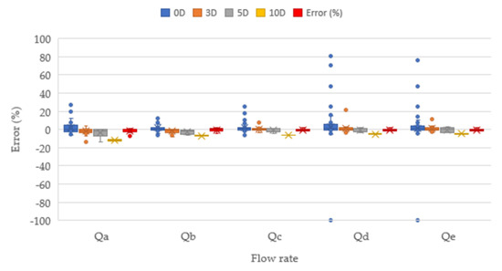 As expected, the closing degree of the valve together with the upstream distance to the meter is one of the parameters that most affect the measuring accuracy. For closing degrees larger than 50% the errors tend to be positive and can easily reach figures larger than +30% (Figure 11). However, the effect on the error of a fully open gate valve, no matter the working principle of the meter and the upstream distance of straight pipe between the valve and the meter, is almost negligible (when compared in the same order of magnitude of the errors found when the valve is more than 50% open). This also seems to be the general behaviour when the gate valve is 33% closed. Errors become slightly larger in comparison when the valve is fully opened but, rarely reached extreme values either positive or negative.