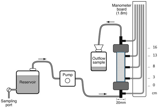 Diagram of column set-up showing source water reservoir, peristaltic pump, column, and manometer board (not to scale) [18].