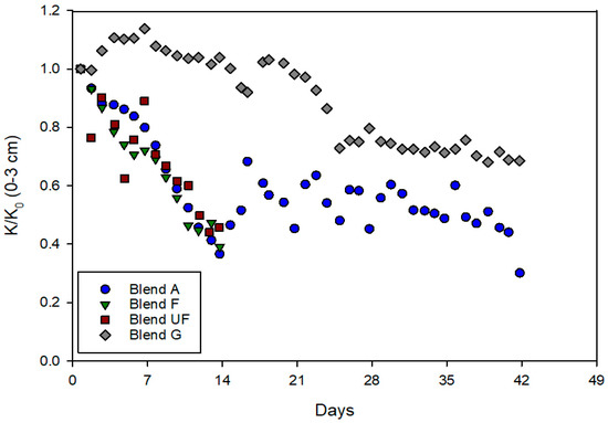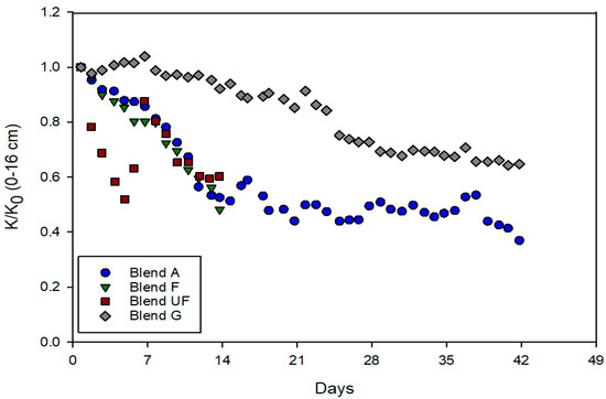 After 14 days of operation, there were declines in hydraulic conductivity (K/K0) for all columns receiving Blend A, Blend F, and Blend UF waters, with declines ranging from 51% to 63% at the 0–3 cm interval (Figure 2) and 39–52% over the entire column (Figure 3), compared with no decline in the Blend G columns at 0–3 cm and only a 7% decline over the 0–16 cm Blend G columns. The K/K0 values plotted are the mean of each pair of columns; between each of these pairs, there was some variation for each water type, with average CV of 1.7% for GAC, 4.8% Blend UF, 8.9% Blend F, and 9.8% Blend waters.