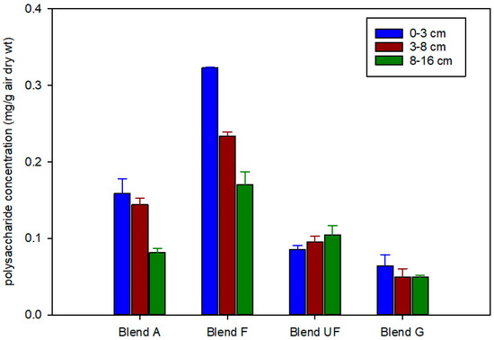 The polysaccharide concentrations provide a quantitative measure of the presence of biofilm. However, as polysaccharide production and consumption are dynamic processes in biofilms, measured concentrations should be assessed as a relative rather than an absolute measure (reported as mg/g aquifer material). Polysaccharides were detected throughout the length of each column, with the highest concentrations generally found near the inlet 0–3 cm (Figure 4), which corresponds to the greatest reduction in K/K0 permeability (Figure 2). However, levels were low, ranging from a minimum of 0.04 to a maximum of 0.32 mg/g, compared with the original sample (pre-packing column material mixed with groundwater) at a level of 0.003 mg/g. Blend A and Blend F had the highest polysaccharide concentrations, and an accumulation of red/brown material was observed near the inlet, which is indicative of iron precipitation within the biofilm. Based on the influent quality and K/K0 reduction, there is no reason to expect lower polysaccharide concentration in Blend UF, unless this material was mobilised and lost prior to column dissection. Other comparable column studies [13,18,33] reported much higher polysaccharide concentrations of 1 mg/g at the inlet of columns associated with receiving water with higher DOC concentrations over 15 mg/L and for river water [18] and higher BDOC (2.5 mg/L) concentrations [33].