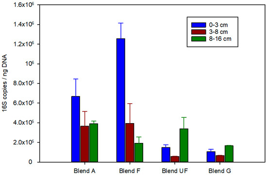 The DNA analysis largely supports the polysaccharide results, with higher numbers near the inlets and in columns receiving Blend A and Blend F. DNA numbers ranged from 5 × 104 to 1.3 × 106 (Figure 5) 16S copies/ng DNA across the four treatments and were comparable to the range reported in similar studies [18] (5 × 103–6.3 × 107 16S copies/ng DNA) with untreated turbid river water, river water treated by bank filtration, by conventional coagulation, and by coagulation and GAC. For the GAC columns, the numbers remained below 1.7 × 105 16S copies/ng DNA, compared with numbers up to 1.3 × 106 16S copies/ng DNA in columns receiving source water without GAC treatment [18].