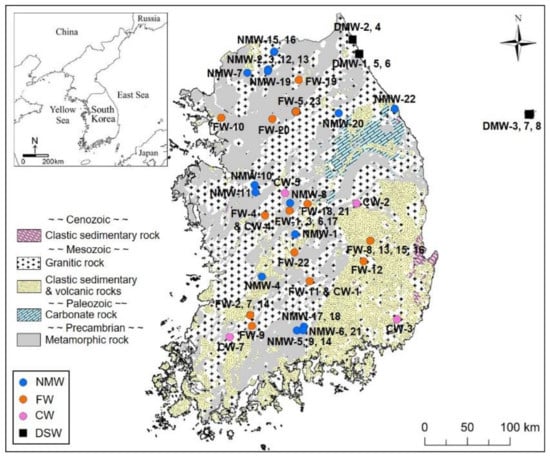 Korean bottled water samples (60) were purchased from Korean markets in 2016; the samples were packed in PET bottles with the capacity of approximately 200 mL~2 L. The samples were divided into four different types based on the label information: natural mineral water (NMW), functional water (FW), carbonated water (CW), and desalinated seawater (DSW). The FW included hydrogen-rich water, alkaline water, and oxygen-rich water. In South Korea, NMW is groundwater sourced from aquifers. The FW is artificially manufactured by adding various additives (e.g., vitamins, oxygen, and hydrogen) or by electrolysis, regardless of the source water. According to the label information, CW is produced by adding artificial CO2. Groundwater-derived bottled water mainly originates from areas underlying granitic and metamorphic rocks (Figure 1).
