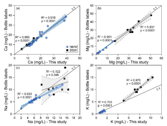 Comparison of major cation concentrations measured in this study and those on bottle label: (a) Ca, (b) Mg, (c) Na, and (d) K. The regression lines for NMW and DMW are superimposed within the range of 95% confidence interval.