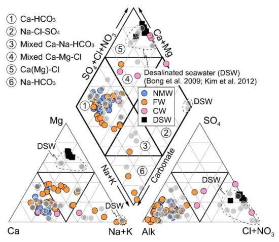Piper diagram including four types of Korean bottled waters along with previous studies [12,13].