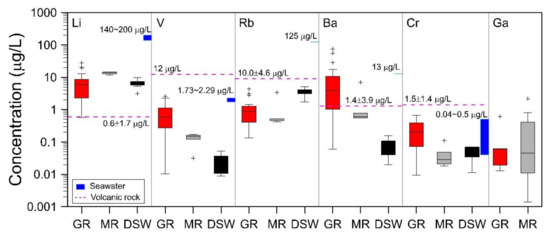 Box-whisker diagram showing concentration of some trace elements of Korean bottled water originating from different lithological units and seawater. GR, MR, and DSW represent granitic rock, metamorphic rock, and desalinated water, respectively. Please see the text for literatures regarding concentration of trace elements in seawater and volcanic rock.