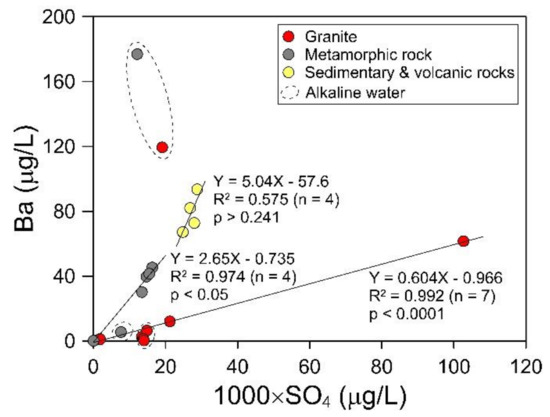 There was a significant relationship between Ba and SO4 for the FWs derived from granitic rocks (except for alkali water) (Figure 5). Similar linear relationships are evident for the FWs derived from metamorphic and clastic sedimentary/volcanic rocks. Various Ba-bearing compounds form in water under alkaline conditions, and Ba in alkaline water in this study was not correlated with SO4. This result suggests that FW chemistry was not influenced by manufacturing processes (e.g., Gibbs diagram). These apparently conflicting results reveal the difficulty determining whether the water chemistry of the FWs was affected by manufacturing processes, water–rock interactions, or both.