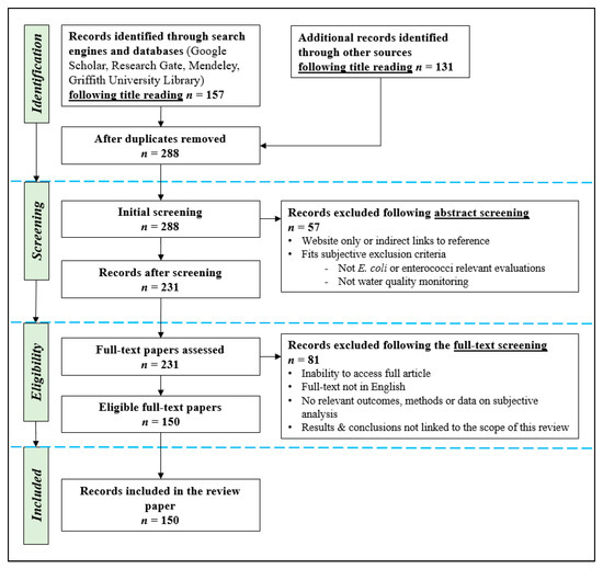 Irrelevant papers were subsequently removed from the original 288 papers using a three-stage filtering system to select papers by inclusion criteria: (1) title reading, (2) interpretation of the abstract, and (3) full-paper reading. Abstract screening was an important aspect of the initial screening process to synthesize the extant literature down to the citations that should be full-text screened and included in the review [25]. This filtering system resulted in 150 papers. This review critically investigated current research gaps in FIB detection tools and methods for the monitoring of E. coli and enterococci, including pros and cons, and provides future directions in these areas.