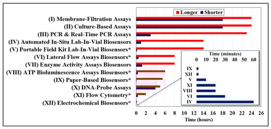 The Colilert (for E. coli) and Enterolert (for enterococci) assays, with their own processes, provided final detections of GUS activity for E. coli and glucosidase activity for enterococci through fluorescence viewed under UV lights, and the fluorescing wells were counted as positive reactions. These processes required filtration, selective media, defined substrate technology, and specific reagents. Bushon et al. [101] performed a holding time comparison for Colilert and Enterolert by analysing samples within 8 h using presence and absence detection methods and within 18–30 h using quantitative methods. They determined that the results for the Enterolert method was not significantly different; however, for Colilert, the quantitative laboratory methods for samples analysed within 18–30 h showed a statistically significantly higher detection frequency than the presence and absence detection method for analysis within 8 h. They identified that result times were at a minimum within 8 h but Colilert had better results within 18–30 h; and that both methods required multiple processing steps, which limited the efficiency [101].