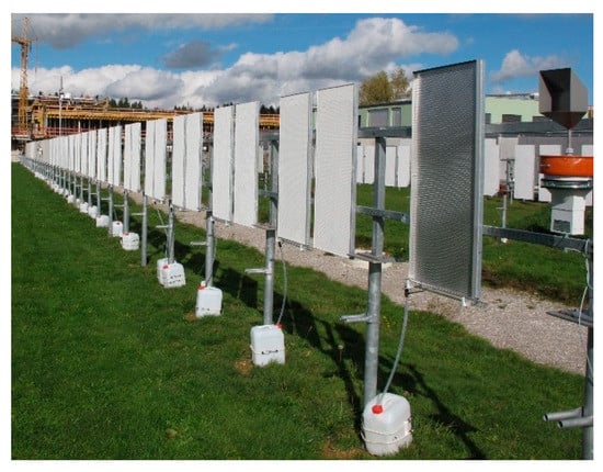 The VTP used during the outdoor tests were located in outdoor facilities at the Fraunhofer Institute for Building Physics (IBP) (47°52′30″ N, 11°43′41″ E) in Valley, Bavaria (Germany). Experimental VTP (each 0.5 m wide, 1 m high) consisting of stainless steel panels were covered by various plasters or mortars (see Figure 1). A detailed description of the sampling site and data analysis are provided in [,].
