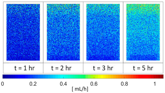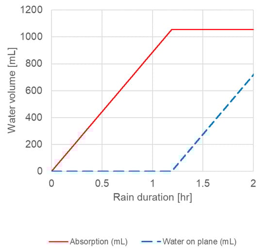 For the VTP exposed to t = 2 h, a total absorption of 1.05 L was found. After t = 4284 s, the material was fully water saturated, and the water started to accumulate on the surface. The total amount of WDR available on the plane during the rest of the rain event was 0.87 L. This water volume was later available for runoff. The observed absorption and accumulated water volume in the material can be seen in Figure 3. The sorption capacity of the material led to a quick saturation of the surface and the building of runoff. If the water volume in the material was not taken into account, an underestimation of almost 45% of the moisture content after 1 h took place on the VTP. These results are similar to those presented by Van den Brande [].