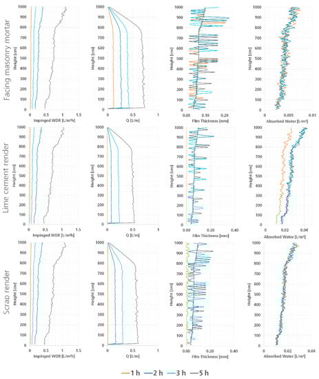 These absorption coefficient values are commonly used in the plaster and mortar industry as standard values. In accordance with the contact angles given by Steffgen [], mineral-bound plasters have angles of <90°. The CWFT is mainly influenced by the contact angles of the material, but this influence can be neglected because the plasters tested were mainly composed of mineral-bound materials and compositions very similar to those in Table 1. As seen in Table 1, the main parameter having an influence on the runoff volume was the absorption coefficient of the material. This parameter limits the amount of water that cumulates on the façade surface after a certain time duration of a rain event. The water film thickness varied with time (Figure 4). Film formation only started after the material’s absorption boundary condition was complied with. For the lime cement render, this film thickness was formed after 1 h of receiving WDR impingement. Meanwhile, regarding the other two materials, this film was formed within the first hour of the rain event. The reason for this was that the lime cement render has a higher absorption coefficient () than the other two materials, thus absorbing more water. As a result, it needed more time to start forming a surface water film. The maximum film thicknesses during the rain event were 0.22 mm, 0.19 mm, and 0.23 mm for the facing masonry mortar, lime cement render, and scrap render, respectively. After applying the absorption boundary condition, the film thickness continued to grow, and the water travelled down the VTP. This behavior could also be observed in the flow rate figures when comparing the first hour of the facing masonry mortar with the plasters. Runoff started within the first hour for the facing masonry mortar, meaning that the wall absorbed enough water before complying with the absorption boundary condition and, subsequently, forming a water film thickness thick enough to start the transportation of the water down the surface of the VTP. This behavior was not evident for the other two materials, meaning that no runoff was present within the first hour. When runoff occurred, the flow rate at the center and bottom of the VTP was constant, meaning that most of the water impinging on the upper side of the VTP tended to flow downward, thus causing higher flow rates in the center and bottom part of the VTP. This effect was observed for all three materials. Higher flow rates were achieved in the facing masonry mortar (0.78 L/m), which tended to accumulate higher amounts of water volume on its surface due to a lower capillary absorption coefficient. With respect to the lime cement render and the scrap render, no flow rate resulted within the first hour of the rain event, meaning that there was not enough water on the surface of the VTP to start the runoff. This behavior was directly related to the formation of the water film thickness and the absorption capacity of the material.
