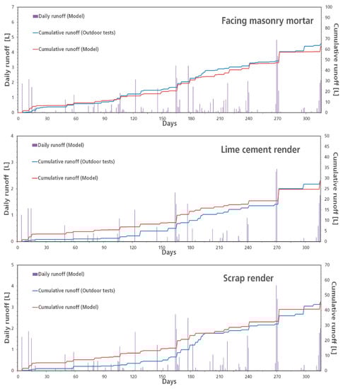A period of 315 days was simulated using the VTP runoff model. For the facing masonry mortar, the cumulative runoff volume obtained in the field tests after 315 days was 65.3 L, whereas the VTP runoff model obtained 63.1 L as a cumulative runoff result for this same material. The outdoor test cumulative runoff volumes for the lime cement render and the scrap render were 28.6 L and 45.4 L, respectively. The results obtained by the model for the previously mentioned materials were 29.5 L and 46.0 L. The difference between the results obtained in the field tests and the results provided by the model at the end of the simulation was less than 3.5%. The results of the simulation vs. the outdoor test cumulative runoff volumes for the three materials are depicted in Figure 5.