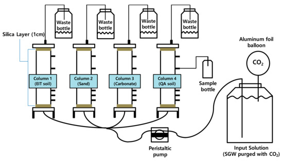 Each column was packed with four different geological materials, for which the characteristics of each column are shown in Table 2. Column 1 used soil the from EIT field site, which represents a silicate aquifer. The EIT site is a test site at which the K-COSEM research center is conducting a groundwater monitoring project by artificially injecting CO2 to the aquifer and located in Eumseong-gun, Chungchengbuk-do, Korea [35,36]. Detailed hydrogeological information can be found in Jun et al. [37] and Ha et al. [34]. Column 2 was packed with clean sand, which mainly consists of quartz (SiO2), and was served as a control column in terms of geochemical behaviors. Column 3 was constructed by mixing the clean sand with limestone sieved in 2~95 mm (mass ratio of 9:1), and it represents a carbonate aquifer. Column 4 was constructed to represent a CO2 storage site in a coastal area, and it was packed with Quaternary alluvium soil collected from Buan-gun, Jeollabuk-do, Korea. In order to make an even flow through the column, a 1 cm layer of silica was spread onto the top and bottom of each geological medium, thus, the layer of each geological material was approximately 38 cm. The columns were wrapped with aluminum foil to minimize the growth of algae during the long-term experiments.