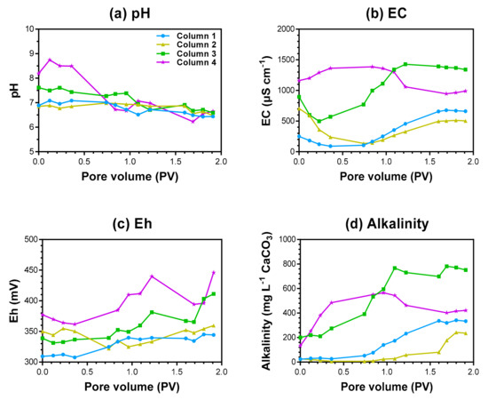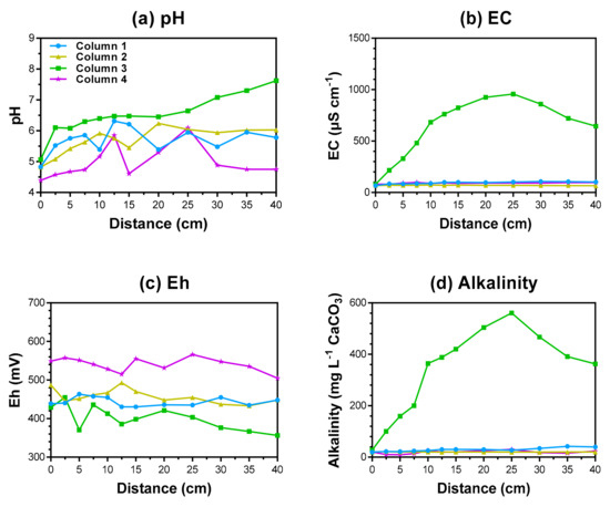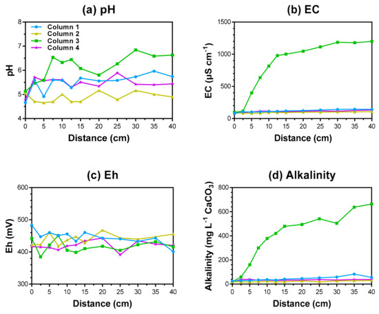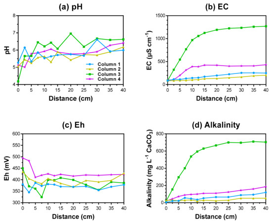 The pH values along the distance of the columns generally increased, with the highest increase observed in column 3 (Figure 5). As pH increases, it shifts carbonate equilibria, causing an increase in bicarbonate (HCO3−) concentration and thus increase in alkalinity. This increase in alkalinity may be one of the contributors to the increase in EC in addition to the dissolution of minerals. The Eh values had the opposite trends to those of pH.