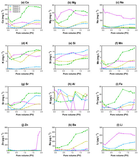 The initial changes in concentration ((a) Ca; (b) Mg; (c) Na; (d) K; (e) Si; (f) Mn; (g) Sr; (h) Al; (i) Fe; (j) Zn; (k) Ba; and (l) Li) up to two pore volumes (PVs) as the CO2-saturated SGW was introduced into the column (time-series data at the column effluent).