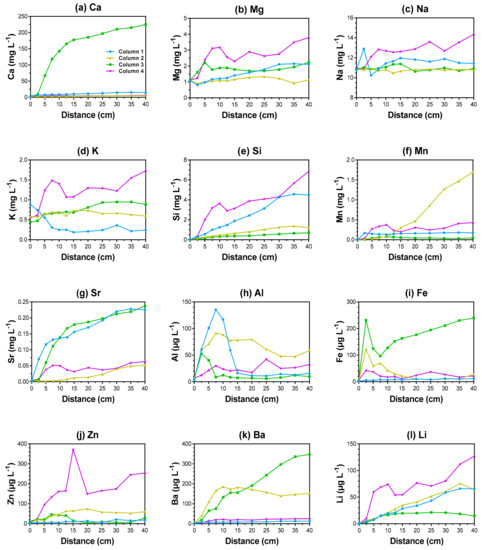 Spatial changes in cation concentrations along the distance of each column after two weeks of CO2 introduction ((a) Ca; (b) Mg; (c) Na; (d) K; (e) Si; (f) Mn; (g) Sr; (h) Al; (i) Fe; (j) Zn; (k) Ba; and (l) Li).