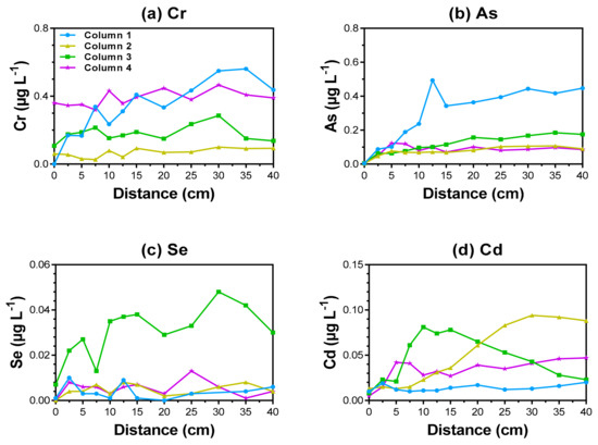 Se showed the highest concentration in column 3. The Se concentrations in the other columns showed only slight increases along the distance of the columns. In the case of Se for column 1, similar concentrations of 0.05~0.06 μg L−1 were maintained throughout the experiment. Cd was detected at relatively higher concentrations in columns 2 and 3. Column 2 showed the increasing concentration patterns with distance, whereas column 3 showed increasing patterns to certain distances and then decreases, suggesting that there may be a sink process for Cd such as adsorption and/or precipitation of cadmium carbonate.