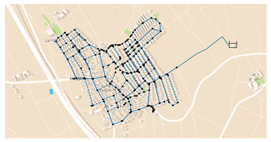 When considering the addition of pipes, the edges representing them must be noted in a similar way. To consider the physical feasibility of the addition of a pipe, the current urban structure is of great importance as pipes cannot be laid between all nodes. Different studies show, and legal standards command, that infrastructures are highly parallel [20,21]. In general, there is a high parallelism between supply infrastructures, i.e., the water, energy and information and communications technology, and the urban transportation network, i.e., streets and pathways. Therefore, the addition of pipes is restricted by the urban transportation network embedded in the present urban structure. Information on the urban transportation system is mostly open access data and can for example be extracted from OpenStreetMap [22]. With this data, the maximum possible edge matrix can be derived as which is equally of size and symmetrical. The edge characteristics of the added pipes can be written into the same matrices , , and .