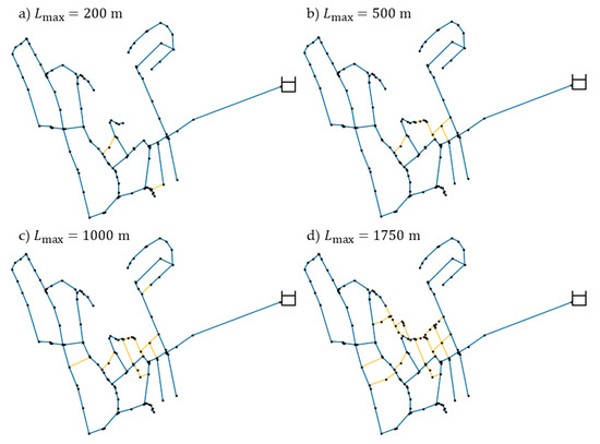 The results of the cost-benefit optimization for an existing WDS leading towards enhanced resilience show that the challenging combinatorial problem cannot be solved intuitively. Interestingly, the resulting adapted main line WDS is not a result of the addition of more pipes to the previous optimum but depends on the overall pipe length allowed to be added to the existing WDS. The pipes chosen to be added can be completely different pipes, as can be noted for = 200 m or = 500 m in Figure 2a,b, respectively. In the case of less overall pipe length added, the closing of an outside loop seems to influence resilience more than adding an edge close to the first branching of the WDS. In turn, for a larger overall pipe length added, this outside loop is discarded and instead, branching close to the first branching is intensified, therefore leading to more low resistance alternative feeding paths. Similarly, this phenomenon can be observed for the different kinds of adapted WDS for = 1000 m and = 1750 m in Figure 2c,d, respectively. In general, pipes added close to the first branching of the existing WDS leading to a refinement and higher meshedness of this area are more likely to remain the same for the increasing instance of . However, pipes closing outer loops in the existing WDS switch depending on the overall pipe length allowed to be added and the already realized refinement of the area close to the first branching. Therefore, these pipes can be interpreted as a possibility for fine tuning of optimal resilience improvement, while pipes meshing the area of the first branching seem to have a significant influence on the overall resilience of the WDS. The latter observation is in accordance with the observations made by a brute force resilience adaptation study previously conducted by the authors [13].
