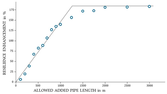 Regarding the resilience enhancement of the different instances, a Pareto front of the optimal relative resilience enhancement for the allowed overall pipe length added to the existing WDS can be mapped for the computed instances (Figure 3). This represents a cost-benefit analysis of the resilience enhancement for the currently existing WDS embedded in its urban structure, reflected upon by determining the maximum possible WDS. The relative resilience enhancement is determined as . The results of these instances show a steady resilience enhancement for longer overall pipe lengths added. For the present WDS and the urban structure it is embedded in, the close to linear resilience enhancement is limited to 130%. The maximum resilience enhancement seems to converge at 180%. Even though the number of pipes and the overall pipe length added to the existing WDS continues to increase, resilience stagnates. This seems to represent a behavior of diminishing returns and, even more so, of resilience saturation.