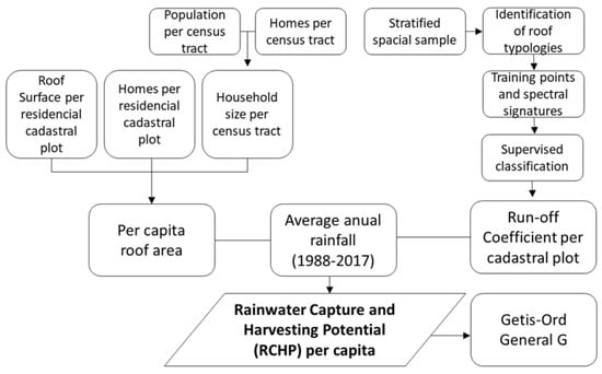 The methodology used was divided into two sequential stages. Firstly, the procedure to estimate the rainwater capture and harvesting potential (RCHP) per capita in residential buildings was undertaken, considering the spatial variability of the runoff coefficient. Data sources and methods used to calculate each of the parameters involved in the calculation of the RCHP equation are described below. Secondly, the spatial distribution of RCHP per capita was analyzed based on the calculation of the Getis-Ord General G statistic, which measures the clustering of high and low values in the study area. The working method is summarized in Figure 2.
