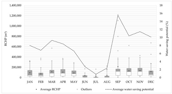 For the whole city, there is a theoretical water-saving potential of 7.42%, considering a domestic water consumption of 14,435,505 m3 according to the data provided for 2014 by the local water company. These results match with those of other studies in similar climatic areas [25]. However, the high inter-annual and seasonal rainfall variability produces large monthly variations in the RCHP and the theoretical water savings for an average rainfall scenario (Figure 3).