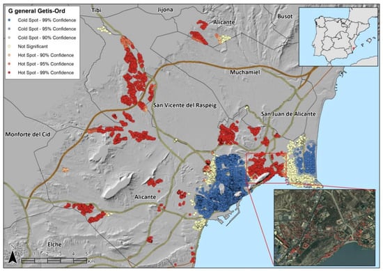 To identify spatial patterns of RCHP per capita in the municipality of Alicante, the Getis-Ord general G spatial association statistic was calculated (Figure 4). This method enables t the per capita RCHP spatial clusters of high (hot spots) and low RCHP values (cold spots) [46].