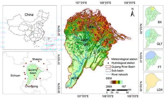 The Qujiang River is the largest tributary on the left bank of the Jialing River, itself a tributary of the Yangtze River in China, which plays a decisive role in the development of Sichuan, Chongqing, and other provinces and cities. The location and general situation of the Qujiang River basin is shown in Figure 1. The Qujiang River basin has a total area of about 38,900 km2. This basin is mainly located to the northeast of the Sichuan Basin and is the granary of northeast Sichuan, with its main outlet located in Chongqing city. The elevation of the study area varies greatly from 2669 m in the north to 187 m in the south. The high-altitude areas are mainly concentrated in the northern border. This basin is a typical subtropical humid area. According to measured data from the meteorological stations from 1970–2015, the average annual precipitation in the basin is approximately 1193.54 mm, and the average annual temperature is approximately 16.6 °C. The precipitation from May–September accounted for about 74.63% of that for the whole year, while the precipitation from November–February accounted for only 5.79%.