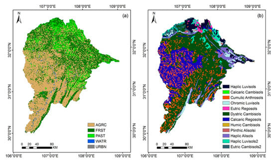 Spatial attribute distribution of the Qujiang River basin: (a) land use cover and (b) soil types.