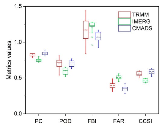 Box plots for the categorical metrics values (Proportion Correct (PC), Probability of Detection (POD), Frequency Bias Index (FBI), False Alarm Ratio (FAR), and Calibration Critical Success Index (CCSI)) of the precipitation detection capacity. The hollow circle represents the mean value, the middle line in the box represents, the median value, and each box ranges from the lower (25th) to the upper quartile (75th).