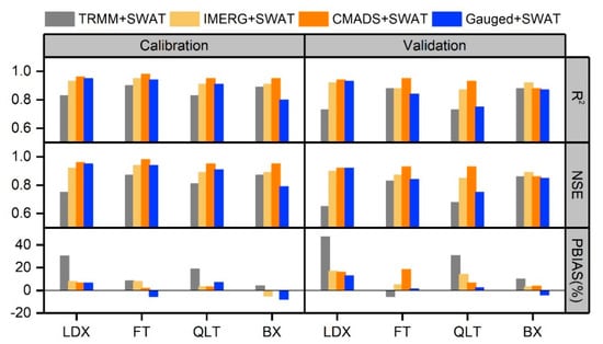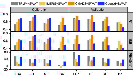 The Performance metrics of the four modes in the daily scale streamflow simulation are shown in Figure 4. Overall, R2 and NSE are mostly above 0.5, while some of the results of PBIAS have excessive deviations. The performance of the four modes varies at different stations. First, we compare the results of the calibration period. In the LDX sub-basin, the NSE of CMADS + SWAT (0.65) is slightly higher than that of Gauged + SWAT (0.61), the R2 of the former (0.66) is slightly lower than that of the latter (0.69), while in PBIAS, CMADS + SWAT (11.5%) is significantly better than Gauged + SWAT (52.3%). IMERG + SWAT’s performance is moderate; its R2 and NSE are 0.59 and 0.57, respectively, and its PBIAS is satisfactory with 24.8%. The worst performer is TRMM + SWAT, whose R2 and NSE values are 0.53 and 0.50, respectively, and whose PBIAS is slightly worse than Gauged + SWAT, with 57.2%. The performance of the four modes in the QLT sub-basin is consistent with that in the FT sub-basin—that is, the R2 and NSE of Gauged + SWAT are slightly higher than than those of CMADS + SWAT, the values of TRMM + SWAT are slightly higher than those of IMERG + SWAT, and the PBIAS values of CMADS + SWAT and IMERG + SWAT are significantly better than those of TRMM + SWAT and Gauged + SWAT. The results at the BX sub-basin are obviously different than those from the other three stations. For the R2 and NSE, CMADS + SWAT is the highest, followed by IMERG + SWAT, while Gauged + SWAT is third, decreasing from about 0.7 in QLT to about 0.5, and TRMM + SWAT is the worst. Except for Gauged + SWAT, the deviations of the other three modes are also reduced, and the PBIAS is within ± 10%. Although the results of Gauged + SWAT at the three stations were satisfactory during the calibration period, the performance metrics in the validation period were obviously reduced. The other three modes showed stable performance in the validation period, similar to the results in the calibration period.