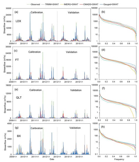 The hydrograph and streamflow frequency curve of the daily streamflow in the calibration and validation periods. (a,b) Luoduxi (LDX); (c,d) Fengtan (FT); (e,f) Qilituo (QLT); (g,h) Bixi (BX).