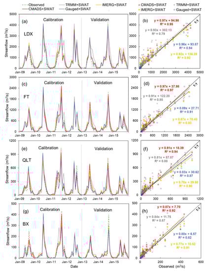 The hydrograph and scatterplot (dashed line represents linear fit) of the monthly streamflow in the calibration and validation period. (a,b) LDX; (c,d) FT; (e,f) QLT; (g,h) BX.