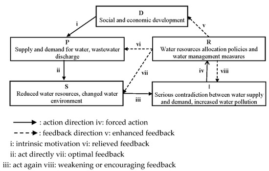 The logic of the DPSIR framework in this paper is described as follows: the increasing water demand and sewage discharge produced from social and economic development (D subsystem) exert pressure (P subsystem) on water resources. Consequently, the water resources state (S subsystem) changes, thereby impacting human welfare (I subsystem). In response, the government or society implements actions (R subsystem) that could provide feedback to any part of this framework. These five dimensions form an organic feedback loop system. The specific feedback path is shown in Figure 2.