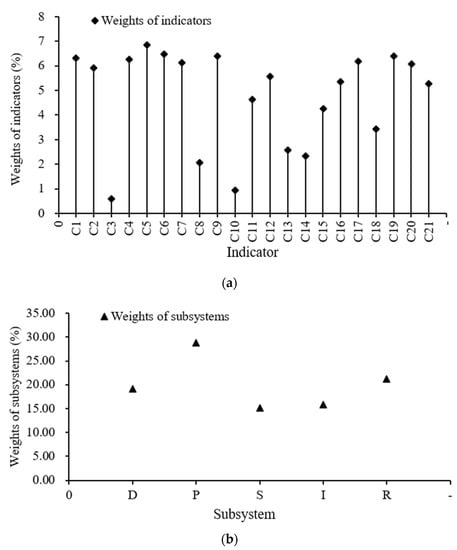 Weights of the indicators (a) and subsystems (b) in the WRCC indicator system.