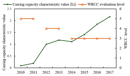 According to the MEE results, the WRCC in Baoding during the 2010–2017 period showed an improving trend from level V (extremely unsafe) to level III (critical state). This result is basically consistent with the change trend in the projected characteristic value z(i), which could be used to characterize the WRCC obtained through the PPC model. Notably, although the evaluation grades in some years remain unchanged as shown in Figure 4, the comprehensive correlation degrees indicate different development trends in the WRCC. For example, the assessment results of the WRCC from 2014 to 2017 continued to be at level III; however, the maximum value of the multi-index correlation degree in 2014 (−0.253) from the adjacent levels II and IV was 0.0335 and 0.0057, respectively, indicating that the WRCC maintained a trend toward level IV in 2014. In 2017, the maximum value of the multi-index correlation (−0.1539) from the adjacent levels II and IV was 0.0722 and 0.1409, respectively, indicating that the assessment result of WRCC trended toward level II. The WRCC in 2017 was slightly higher than that in 2014. In summary, the WRCC in Baoding continued to improve during the assessment period.