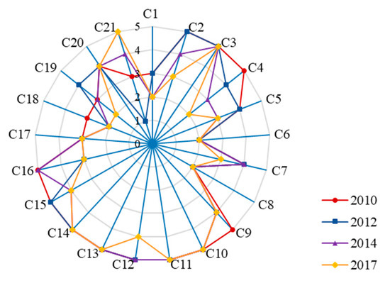 Radar map of the indicator change trends in 2010, 2012, 2014, and 2017.