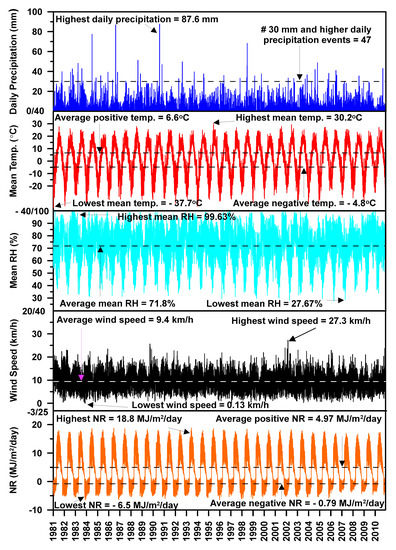 Figure 1 shows the climate data for Timmins, ON for the period 1980–2010. Minimum, maximum and average yearly values for the data are also marked on this figure. The review of the data indicates that the average annual precipitation over the 30-years period is approximately 826 mm. The wettest year (annual precipitation approximately 1034 mm) conditions were observed in 1990, whereas the least annual precipitation (approximately 510 mm) was recorded during the year 2010. The average annual temperature during the 30 period is 1.9 °C. Similarly, the mean annual minimum and maximum temperatures for the period 1981–2010 are −15.2 °C and 18.8 °C. The 30-year average mean relative humidity is 71.8%. Based on the relative humidity data, it is clear that the mean relative humidity for the winter season is relatively higher than that of the summer. The 30-year average wind speed and net radiations are observed to be 9.4 km/h and 4.2 MJ/m2/day, respectively.