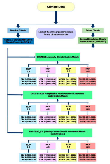 The future climate data were subdivided into thirty-year periods, and each period is designated as a climate ensemble. The 90 years (2011–2100) of future climate data from the three GCMs for four different RCPs formed 36 climate ensembles. Each ensemble refers to a particular GCM, RCP and a 30-year time period. Historical climate data (1980–2010) were designated as ensemble number one increasing the total number of ensembles to 37. A schematic of the climate ensembles with their corresponding GCM, RCP and time periods are shown in Figure 2. It should be noted that ensemble #1, comprising of historical climates, is considered as the base climate against which future climate datasets are evaluated.