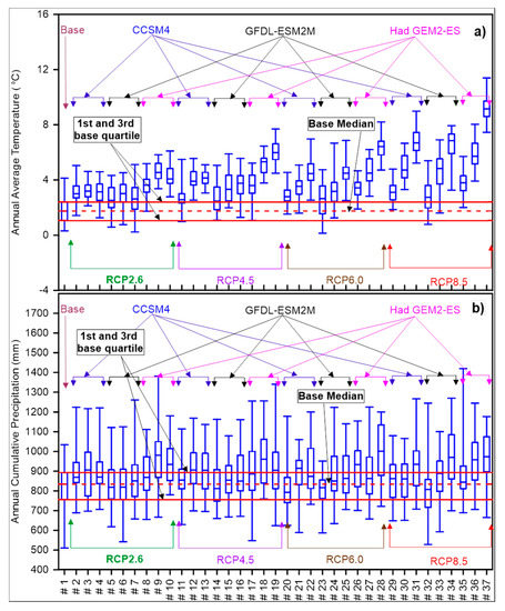 The predicted data for 36 future climate ensembles were compared to the base climate. Figure 3 shows the 30-year annual mean air temperature and cumulative precipitation for the base and future climate ensembles in the form of box and whisker plots. The lower and upper ends of the box show 1st and 3rd quartiles, respectively, while the whiskers show the two extreme values (maximum and minimum). The line in the middle of the box represents the median of the data. The review of the temperature data in Figure 3a shows that for all future climate ensembles, the median temperature shows considerable increase over the median base value. The increasing trend in the temperature data is consistent for all GCMs and radiative forcing values. It can also be observed that, in general, the temperature is expected to increase with RCPs and the number of years. Consistent with the trend, the maximum temperature increase can also be observed for scenarios predicted with RCP 8.5, with the highest increase in temperature for the GCM Had GEM2-E5 (Climate ensemble #37).
