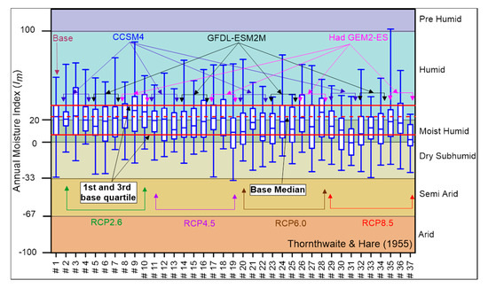 Lowest precipitation alone may not guarantee the driest conditions as the amount of meteoric water that enters the cover also depends on the available evaporative demand. As shown above (Figure 3a), a temperature increase is imminent for all future climate ensembles; it is therefore inevitable that there could be a proportional increase in the evaporative demand as well. In this instance, the estimation of annual moisture index () and classification of climate for future climate ensembles is a useful exercise, as it takes into consideration both the precipitation and the potential evaporation. Potential evaporation was estimated for all future climate ensembles using the modified Thornthwaite method described earlier. Estimated , together with the predicted values, was used to estimate the values for each individual year of every climate ensemble.