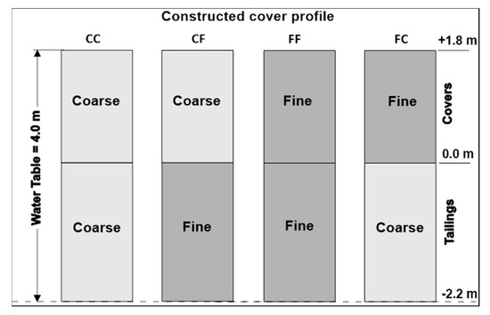 The review of the cover profiles in Figure 5 indicates that for the cover performance assessment, a single cover thickness of 1.8 m can be assumed. The cover can be comprised of either coarse or fine tailings, to represent the heterogeneity observed in the cover materials during the field investigation. Similarly, covers comprising of a coarse or fine material can overlie coarse or fine acid generating tailings to represent the heterogeneity in tailings. Of the four resulting cover profiles, the profile FC represents the original cover design where the fine desulphurized tailings were to be deposited on coarse tailings to create a capillary break [10,30]. According to Dobchuk et al., 2013 [10], the CF profile most accurately represents the as-built desulphurized cover.