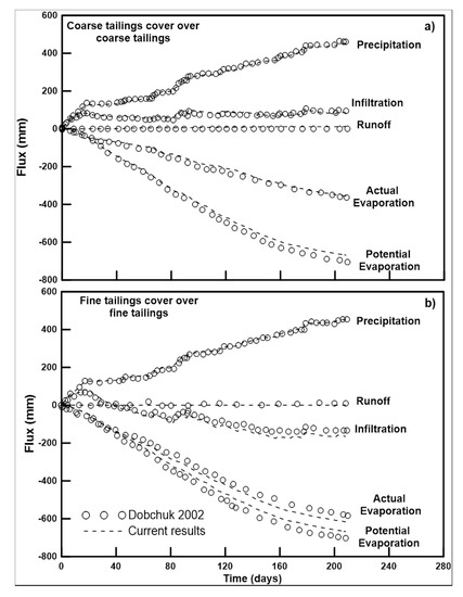 Field measurements to verify/calibrate the model for the mine site are not available. Therefore, an attempt was made to assess the suitability of the current modeling effort by reproducing the results of previous modeling studies carried out at Detour Lake Mine. Dobchuk (2002) [30] predicted the water balance of the tailings covers at the site using the SoilCover numerical code. The modelling results were never quantitatively compared to the site condition, but were reported to provide a qualitative assessment of the tailings covers. The objective of the current study is to assess the effects of climate change on tailings covers; therefore, verifying the model with Dobchuk (2002) [30] modeling results will provide a consistent approach to the previous research carried out at the site. To accomplish this, water balances for coarse and fine tailings covers are compared in Figure 6.