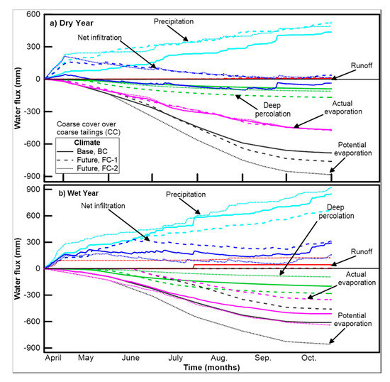 Water balance at the ground surface and at the tailings–cover interface for homogeneous coarse profile, CC for (a) dry year; (b) wet year.
