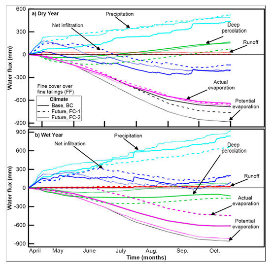Finally, the groundwater table is a key consideration for preliminary design of tailing covers. Fluctuations in the depth of groundwater are expected due to climate change [16], whereby the reduction in annual precipitation and increase in annual evaporation can result in the lowering of the water table. For the climate FC-2, the predicted cumulative PE is roughly 24% higher than precipitation, significant lowering of the groundwater table depth—compromising the performance of the covers—can be expected in the future.