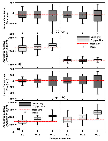 Box and whisker plots for the annual change in storage and surface oxygen flux for (a) the CC and CF profiles and (b) the FF and FC profiles.